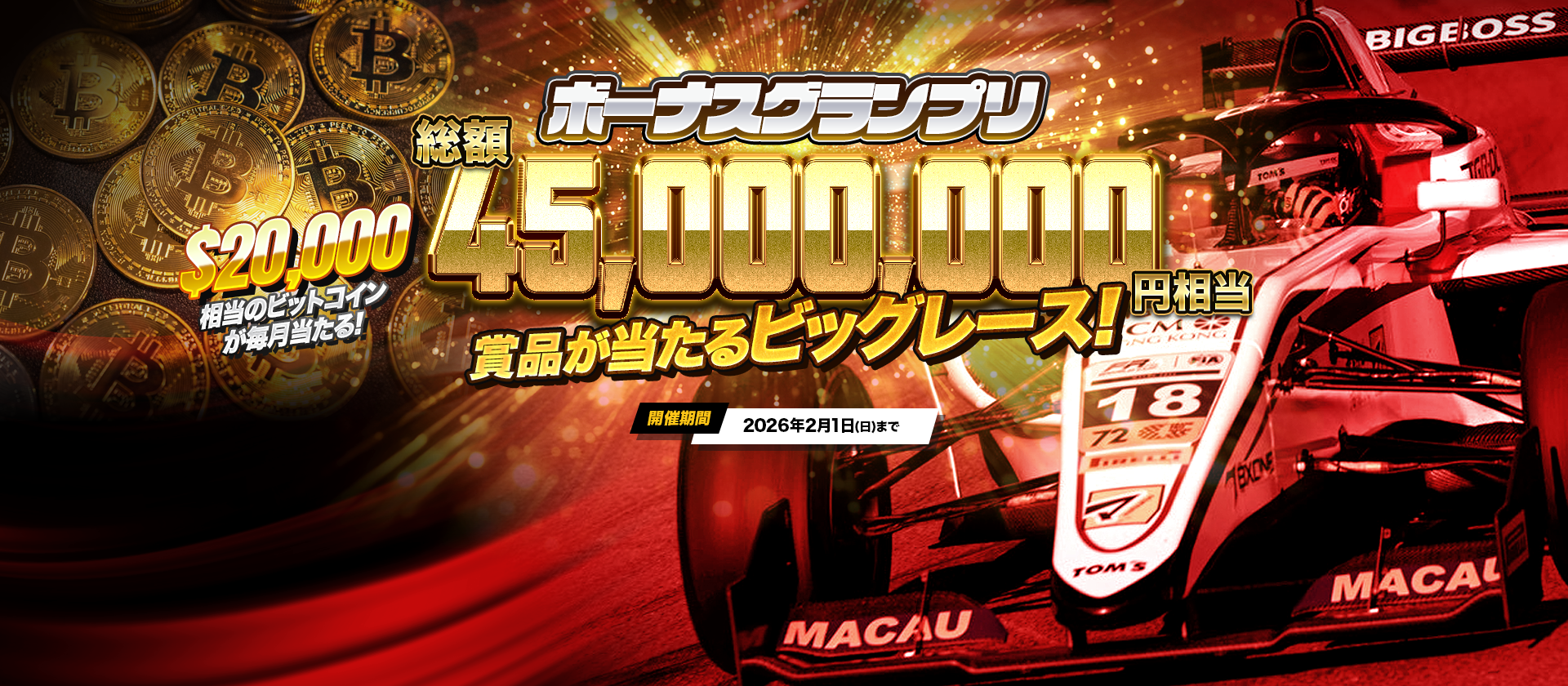 ラストスパートの準備はできていますか? 今すぐBigBossでアクセルを踏み込み、4,500万円相当の山分けと毎月のビットコインチャンスを掴み取りましょう!